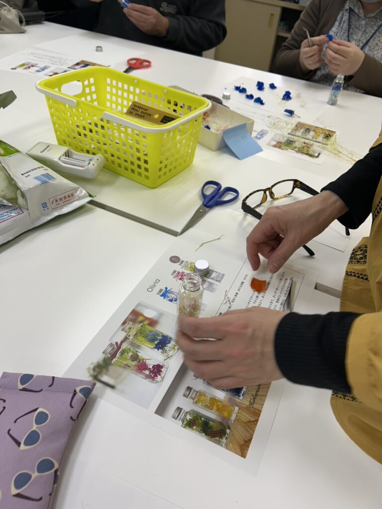 バラとアジサイをメインにカスミソウ、ビーズなどを思い思いにボトルに入れていきます。