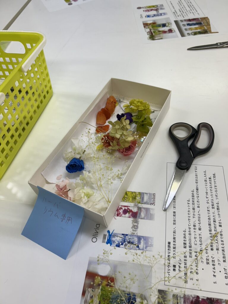 そのハーバリウムを、ラダーサポートで使用しているプリザーブドフラワーと100均の材料だけで作ります。
