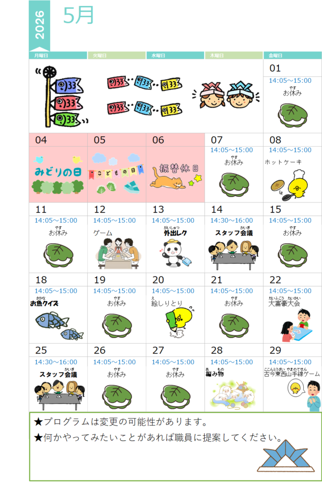 5月のプログラム表を更新いたしましたのでご紹介いたします。